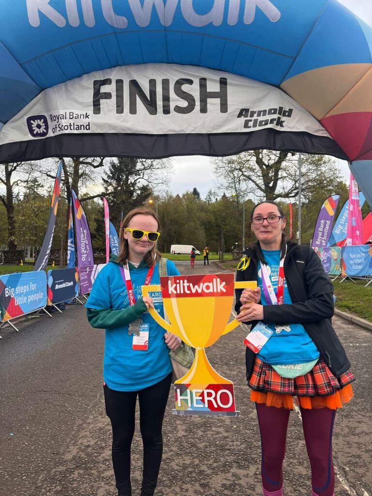 Here we have Emma and her Dad as well as Stroma and Team Sian who all walked 23 miles in the Glasgow KiltWalk event for FPWR, both Emma and Stroma have children with PWS and were their focus to see them to the finish line!