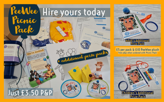 To make the occasion more special we can send you a special Picnic Pack with party invites, a scratch-card to play with your friends, a giraffe toss game, balloons, colouring pages and much more. All we ask is that you cover the postage for just £3.50 and return the pack after your picnic. You can also order adult or child prize packs from us for an extra £5 each (which of course you can keep and distribute), or a PeeWee plush for £10. Both of which are P&P free when ordered with the party park (or £3.50 p&p if ordered separately.)