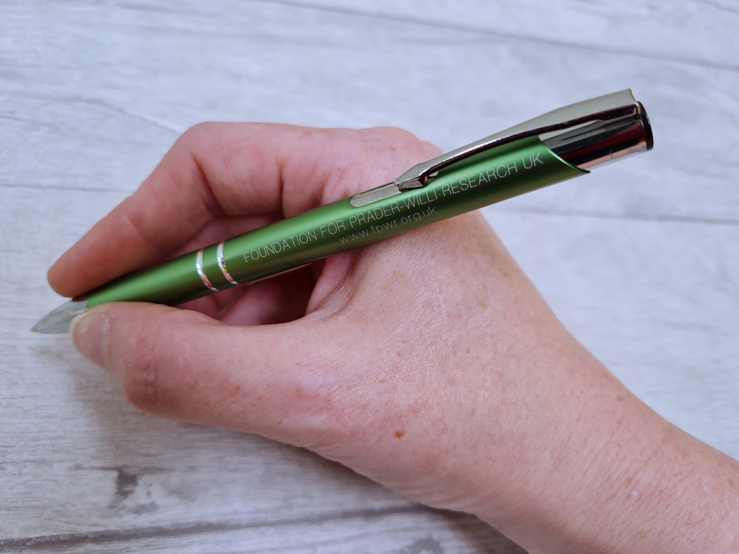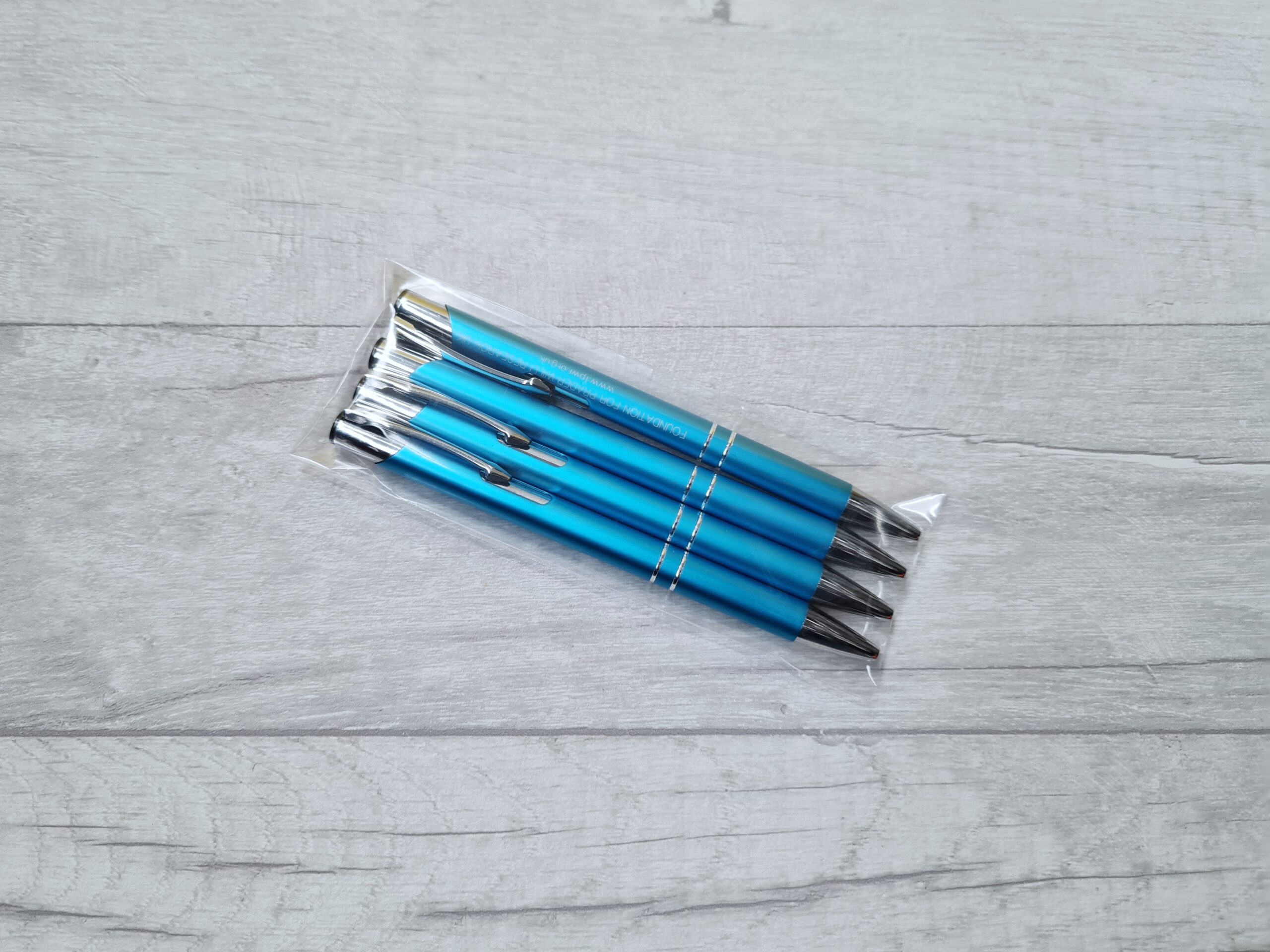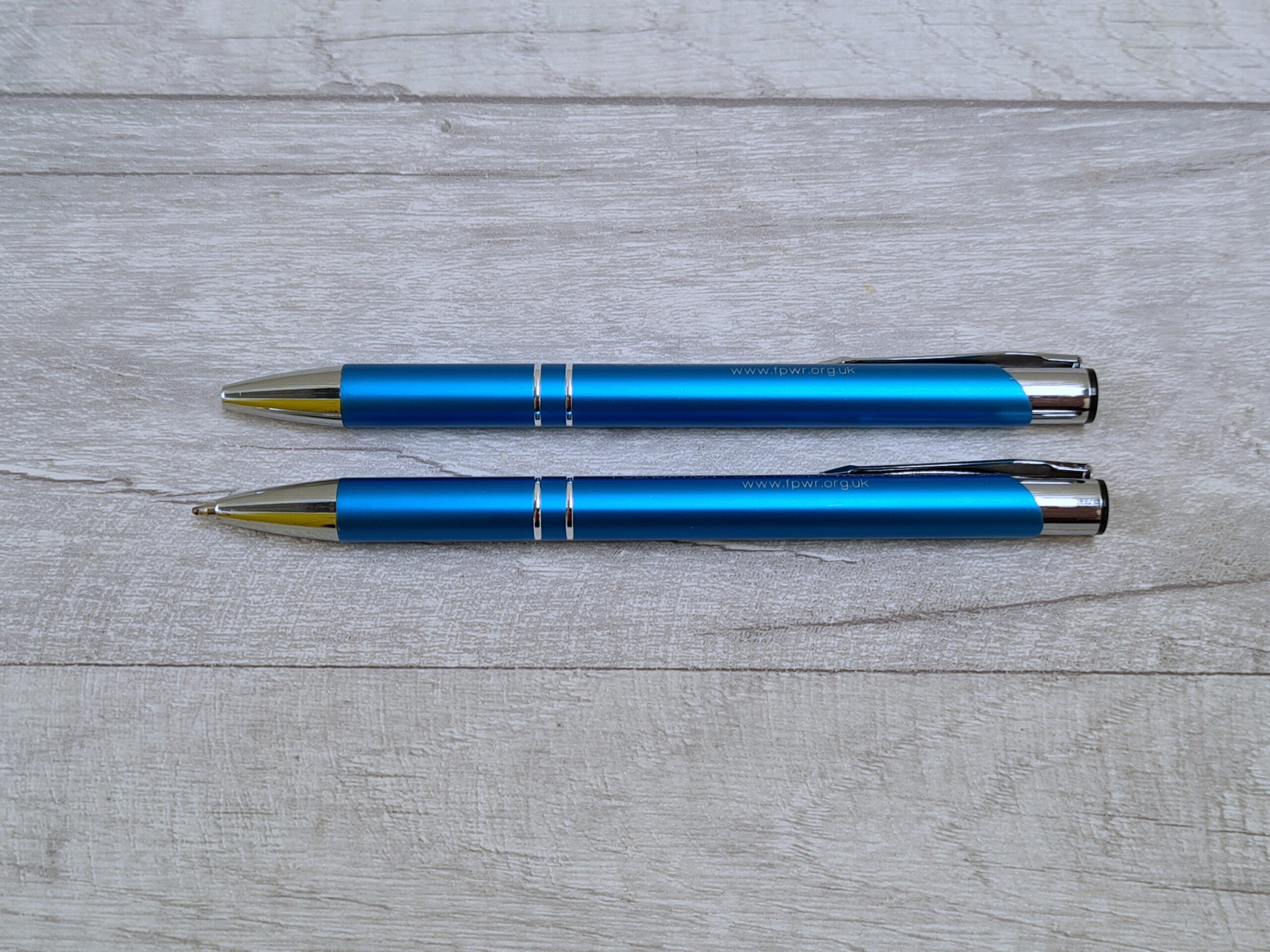 Ball point pens printed with the FPWR UK charity name and website.