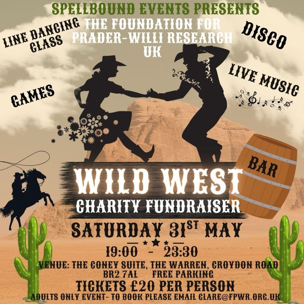 With tickets priced at just £20 per person (over 18s only), this fundraiser is not only a fantastic night out but also an opportunity to contribute to world class PWS research projects. Tickets can be purchased via www.fpwr.org.uk/product/wild-wild-west-charity-fundraiser-ticket/ or if you cannot make it but would still like to support the event you can via Clare’s justgiving page at www.justgiving.com/page/clare-black-5